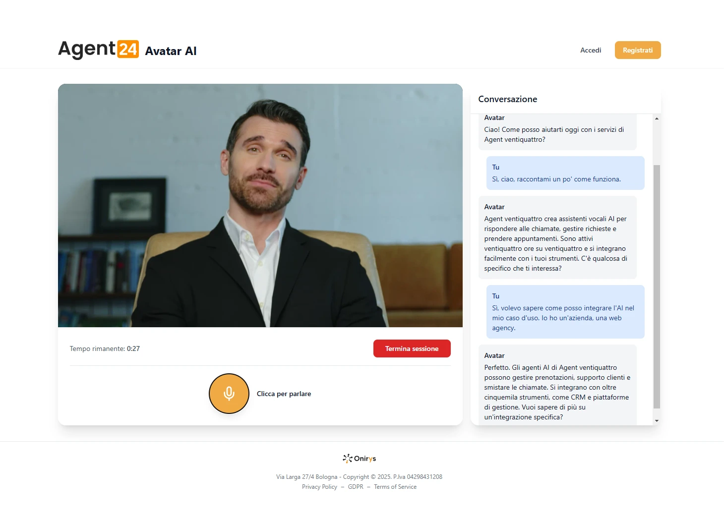 Avatar AI conversazionali che accolgono, informano e sorprendono — 24 ore su 24, con voce e presenza personalizzate.
